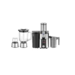 This digital juicer, blender, and grinder features a stainless steel body, 3-speed control with pulse, LED timer, and an 85mm feed tube for whole apples. Includes a 1000ml juice jug, 2000ml pulp jug, 1500ml blender jug, 60g grinder cup, and anti-slip feet.