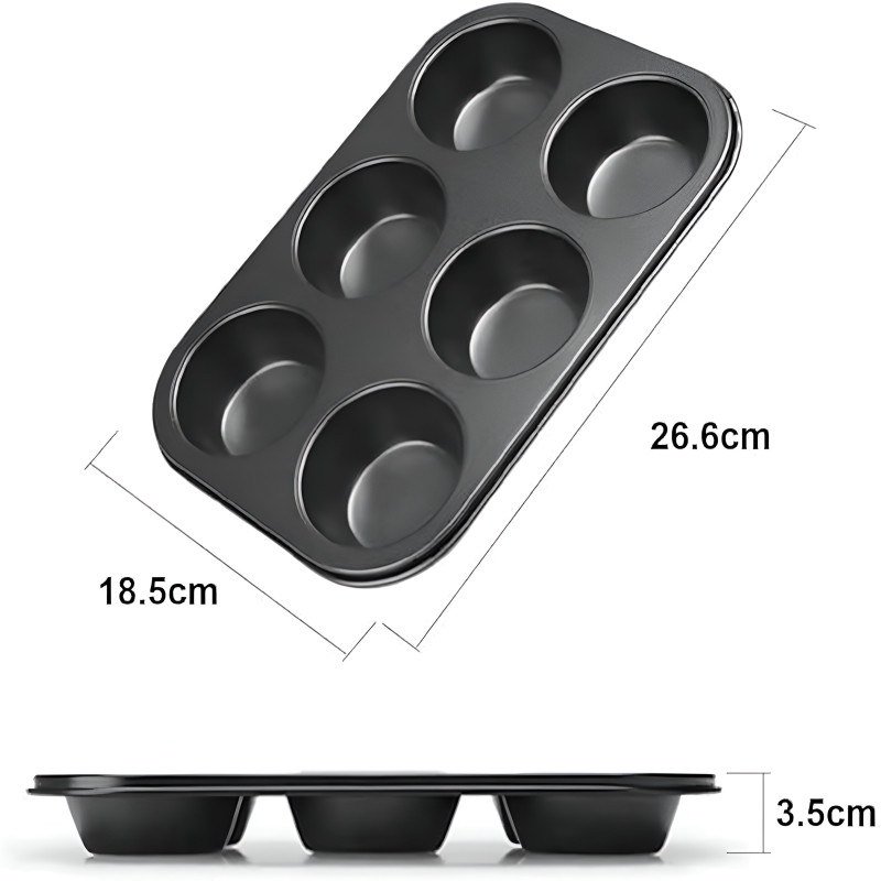 Bake perfect muffins and cupcakes with this Black Carbon Steel 6-Cup Tray. Made from premium carbon steel for even heat distribution, it ensures golden-brown, evenly baked treats every time. The non-stick matte coating makes releasing baked goods effortless and cleanup easy. Ideal for small batches, this durable tray is a must-have for any home or professional kitchen.
